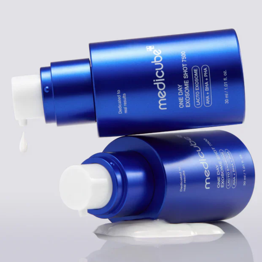 MEDICUBE's One Day Exosome and Pink Collagen Shot ampoules feature Lactobacillus extracellular vesicles (exosomes) for deep skin repair and regeneration.