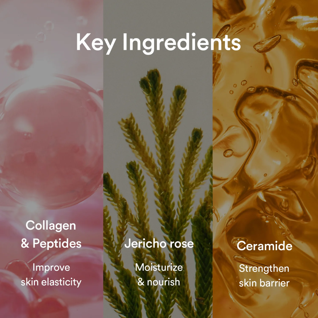 Water, Butylene Glycol, Isopentyldiol, Glycerin, Betaine, Glycereth-26, Niacinamide, Macadamia Integrifolia Seed Oil, Methylpropanediol, 1.2-Hexanediol, Chondrus Crispus Powder, Ceratonia Siliqua (Carob) Gum, Kaolin, Hydroxyacetophenone, Cetearyl Alcohol, Glyceryl Stearate, Hydrogenated Coco-Glycerides, Xanthan Gum, Polysorbate 20, Polyacrylate-13, Allantoin, Propanediol, Glucomannan, Panthenol, Cellulose Gum, Polyisobutene, Octyldodeceth-16, Potassium Chloride, Adenosine, Dextrin, Ethylhexylglycerin, Sodium Phytate, Anastatica Hierochuntica Extract, Sorbitan Isostearate, Dipotassium Glycyrrhizate, Sodium Polyacrylate, Trehalose, Sodium Hyaluronate, Tocopherol, Caprylyl Glycol, Ceramide NP, Collagen Extract, Palmitoyl Tripeptide-5.