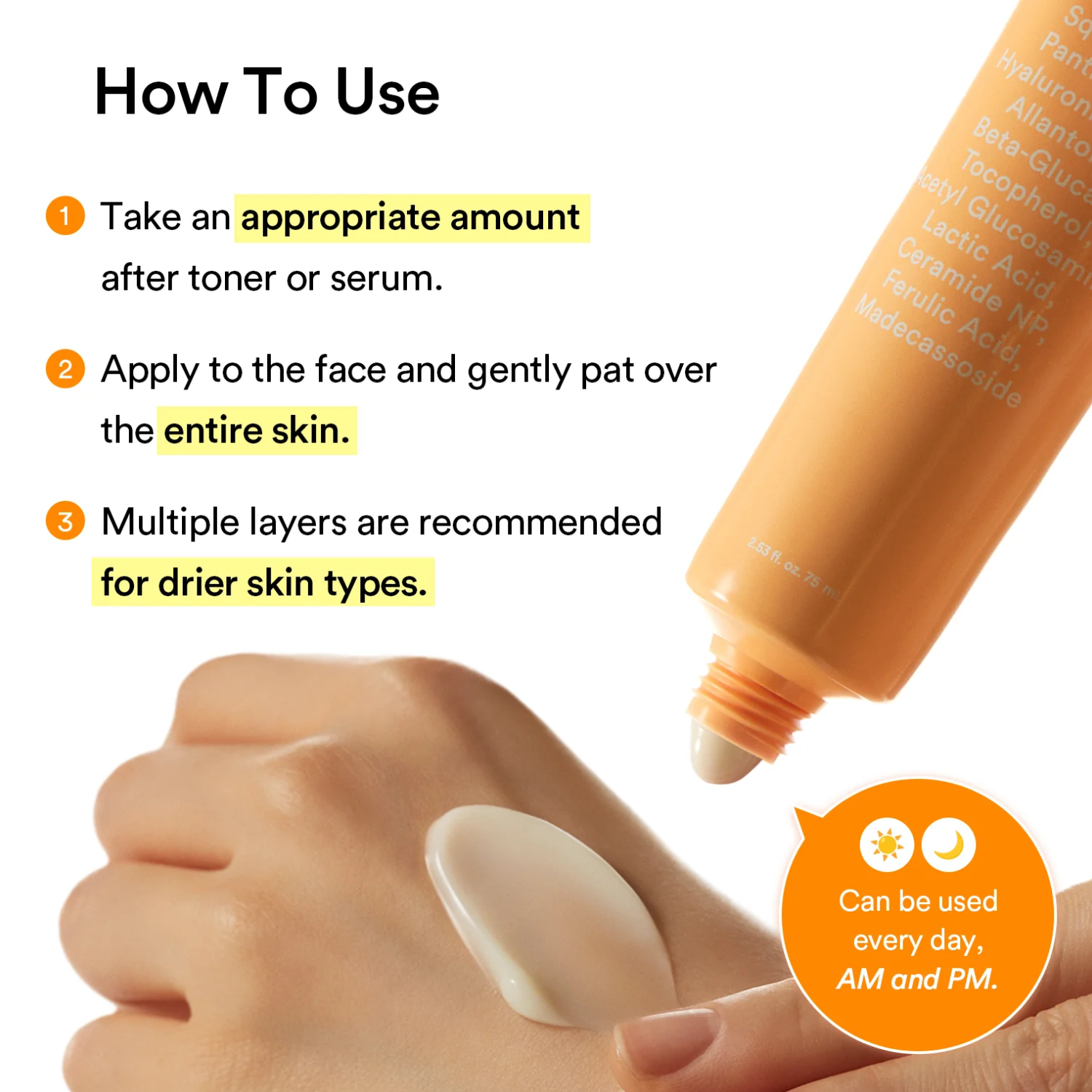 After cleansing and toning, apply a moderate amount to the skin evenly and gently pat it for better absorption.