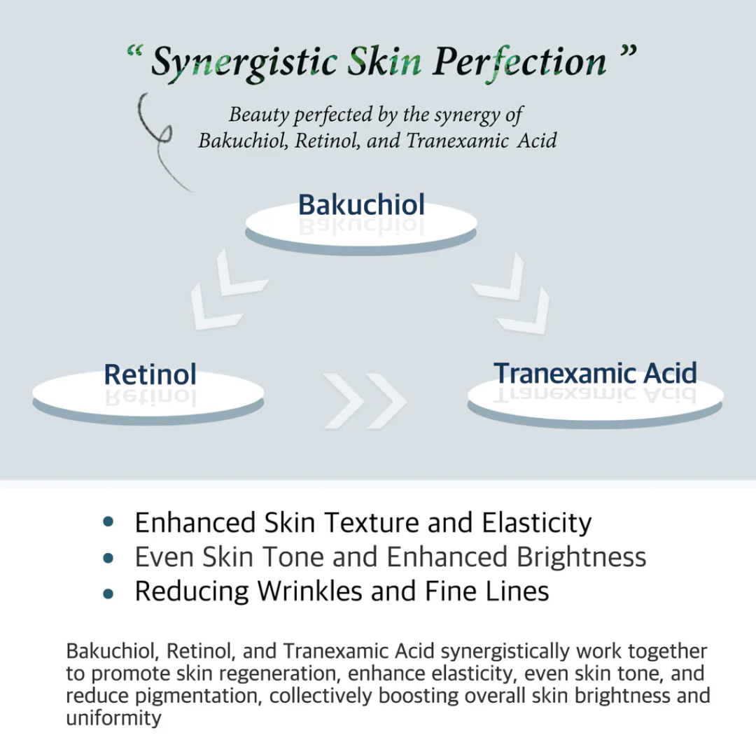 COS DE BAHA (RT) Retinol Tranexamic Acid Cica Serum is a multi-functional serum designed to target signs of aging, hyperpigmentation, and skin sensitivity. Formulated with Retinol to smooth fine lines, Tranexamic Acid to reduce dark spots, and Bakuchiol for gentle skin renewal, this serum promotes a brighter, more even complexion. Soothing ingredients like Centella Asiatica (Cica), Panthenol, and Sodium Hyaluronate hydrate and calm the skin, while Ceramide NP strengthens the skin barrier. Enhanced with antioxidant-rich botanical extracts, this serum helps achieve a balanced, youthful glow.