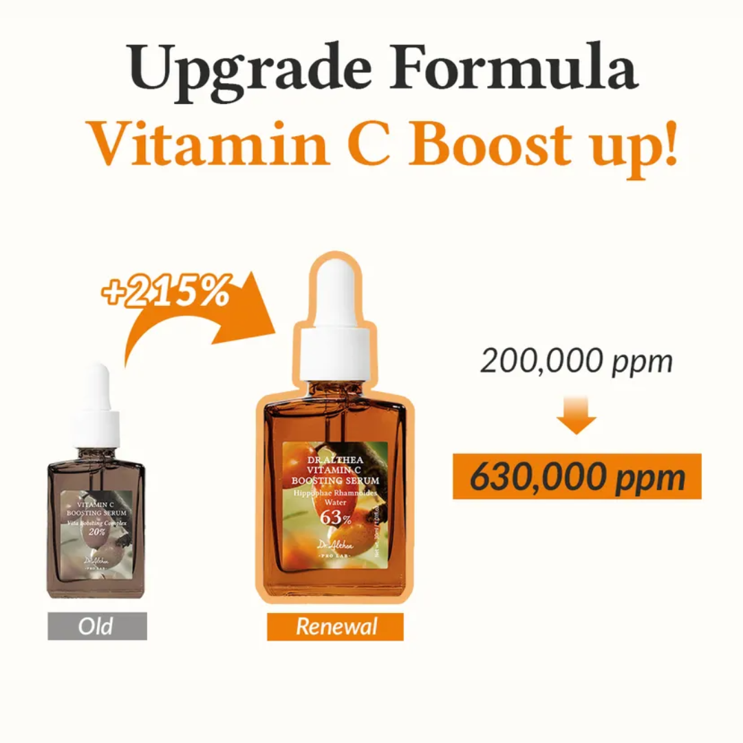 DR. ALTHEA Vitamin C Boosting Serum contains a 63% Vita Boosting Complex with 9 types of vitamins, including Hippophae Rhamnoides Fruit Extract, to revitalize and nourish the skin. Enriched with 45,000ppm of brightening ingredients such as Niacinamide, Tranexamic Acid, and Alpha-Arbutin, it helps improve dark spots, blemishes, and uneven tone. The formula also features Centella Asiatica, Hyaluronic Acid, and Ceramide NP to hydrate, soothe, and strengthen the skin barrier, leaving the complexion radiant and smooth.