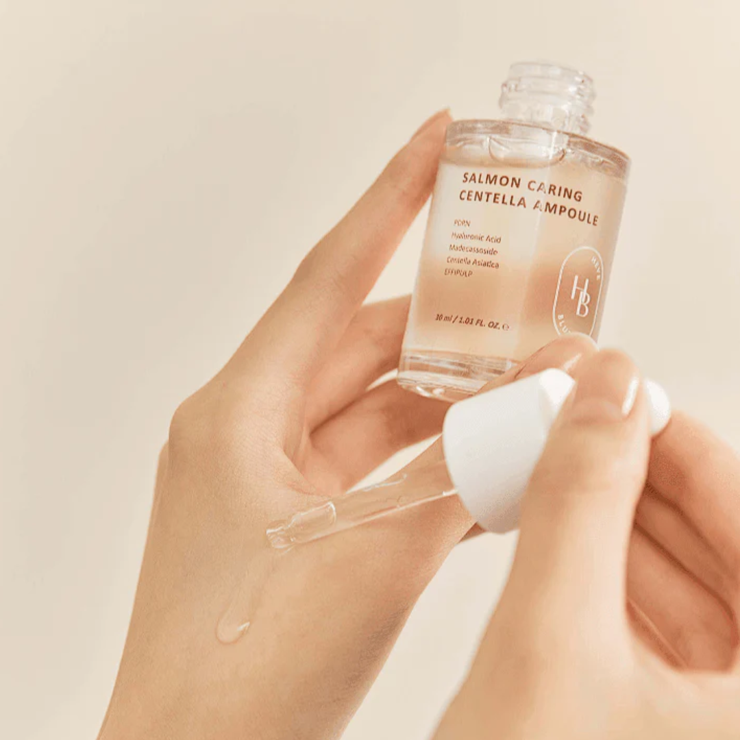 HEVEBLUE Salmon Caring Centella Ampoule is a calming and deeply hydrating serum designed to strengthen and repair sensitive skin. Packed with Centella Asiatica Leaf Water, Salmon Egg Extract, and multiple forms of Hyaluronic Acid, it helps soothe irritation, boost moisture, and support skin recovery. Lightweight yet nourishing, it leaves the skin smooth, refreshed, and resilient.