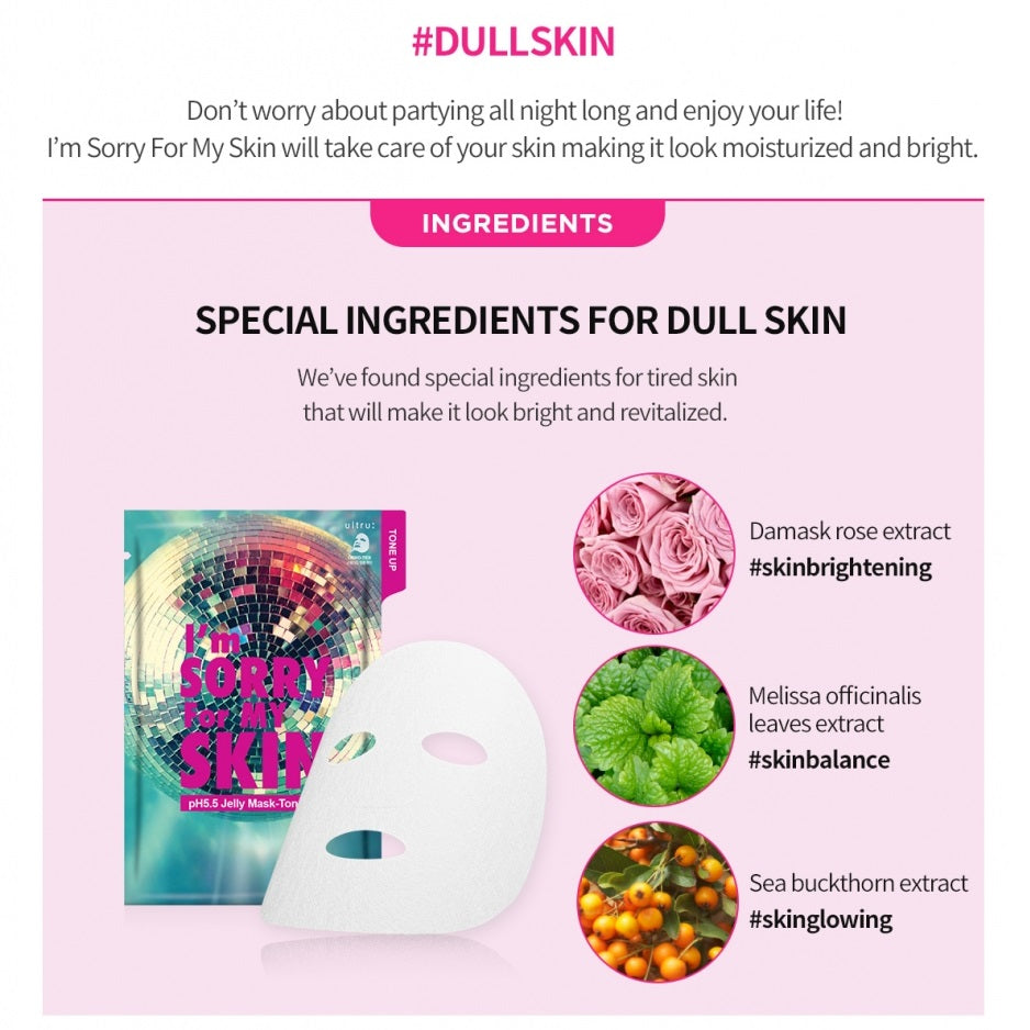 • I'M SORRY FOR MY SKIN pH 5.5 Brightening Jelly Mask is specially formulated to harmonize skin pH while illuminating the complexion. It incorporates soothing Centella Asiatica and hydrating Panthenol with the brightening power of Rosa Damascena and citrus extracts. This mask's unique jelly texture allows for maximum absorption, ensuring that these potent ingredients effectively nourish and revitalize your skin. Perfect for those looking to enhance their skin's natural radiance and maintain optimal pH balance.