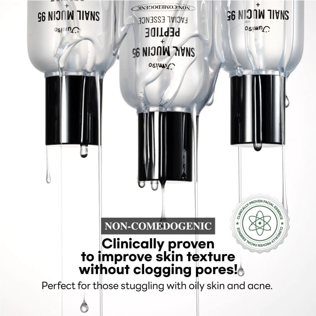JUMISO Snail Mucin 95% + Peptide Essence is a highly concentrated essence that features 95% Snail Secretion Filtrate to deeply hydrate and repair the skin. It is enriched with a blend of Peptides, including Copper Tripeptide-1 and Palmitoyl Pentapeptide-4, to enhance skin elasticity and reduce the appearance of fine lines. The formula also includes Sodium Hyaluronate and Panthenol for additional moisture retention, leaving the skin smooth, plump, and rejuvenated. Ideal for those looking to boost their skincare routine with powerful anti-aging and hydrating benefits.