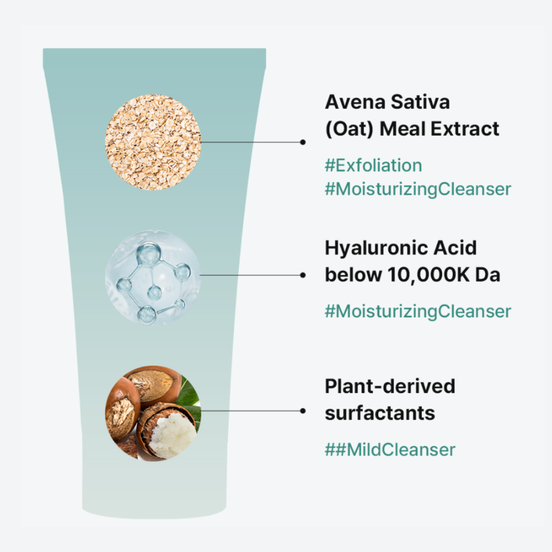 Water/Aqua/Eau, Glycerin, Myristic Acid, Stearic Acid, Potassium Hydroxide, Palmitic Acid, Lauric Acid, Dipropylene Glycol, Sorbitan Olivate, Cocamidopropyl Betaine, Sodium PCA, Glyceryl Stearate SE, Hydroxyethyl Urea, Potassium Cocoyl Glycinate, Sodium Chloride, Polyquaternium-67, Disodium EDTA, Acrylates/C10-30 Alkyl Acrylate Crosspolymer, Potassium Cocoate, Polyquaternium-7, 1,2-Hexanediol, Hyaluronic Acid, Sodium Benzoate, Avena Sativa (Oat) Kernel Extract, Beta-Glucan.