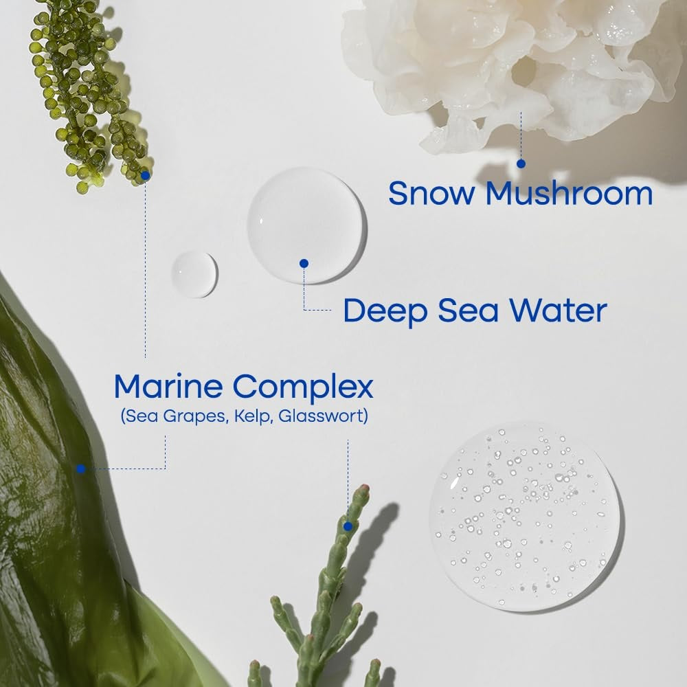 Sea Water (66.01%), Butylene Glycol, Propanediol, Glycerin, Water, 1,2-Hexanediol, Caprylic/Capric Triglyceride, Hydrolyzed Glycosaminoglycans, Betaine, Ectoin, Tremella Fuciformis (Mushroom) Extract, Tremella Fuciformis Polysaccharide, Salicornia Herbacea Extract, Laminaria Japonica Extract, Caulerpa Lentillifera Extract, Acetyl Hexapeptide-8, Copper Tripeptide-1, Acrylates/C10-30 Alkyl Acrylate Crosspolymer, Xanthan gum, Allantoin, Adenosine, Tromethamine, Disodium EDTA, Ethylhexylglycerin.