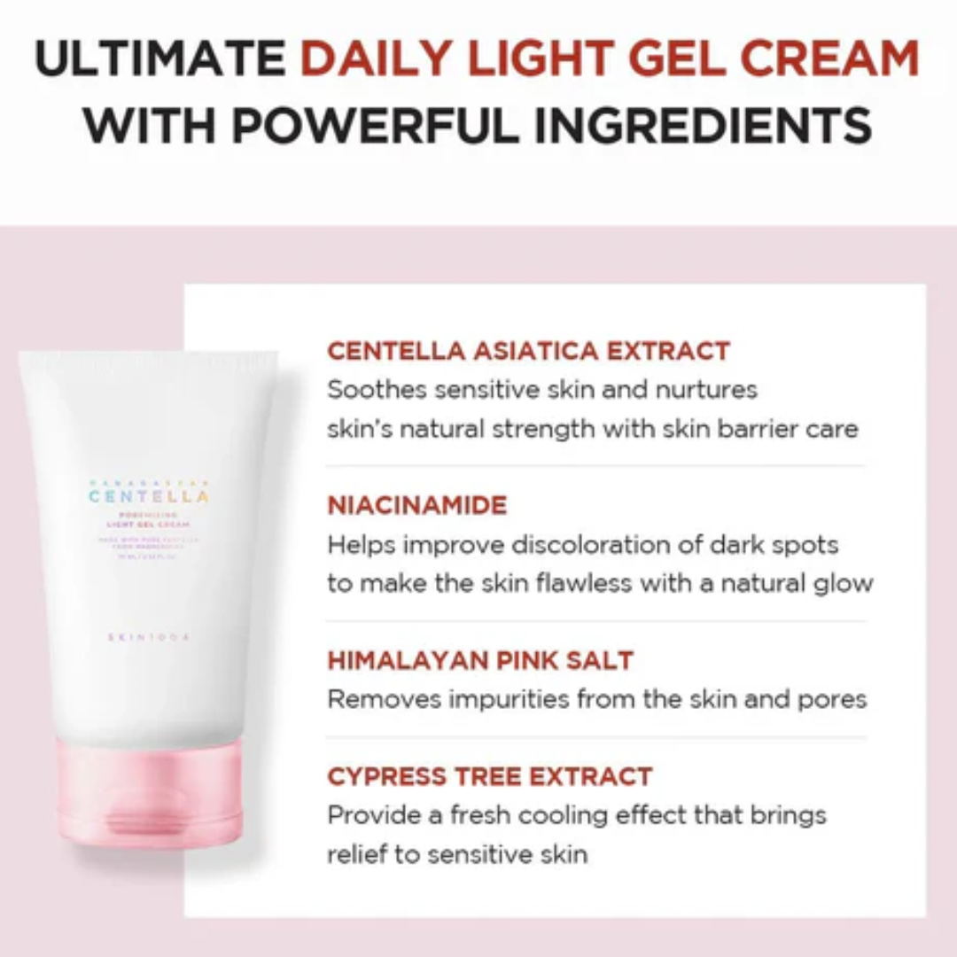 SKIN1004 Madagascar Centella Poremizing Light Gel Cream is a lightweight, hydrating gel cream designed to control oil production, minimize pores, and improve skin texture. Formulated with Centella Asiatica Extract, Aloe Vera, Pink Mineral Salts, and three types of Hyaluronic Acid, it provides soothing hydration while enhancing skin elasticity and radiance. The lightweight formula absorbs quickly, making it ideal for balancing oily skin and leaving your complexion smooth, fresh, and mattified without clogging pores.