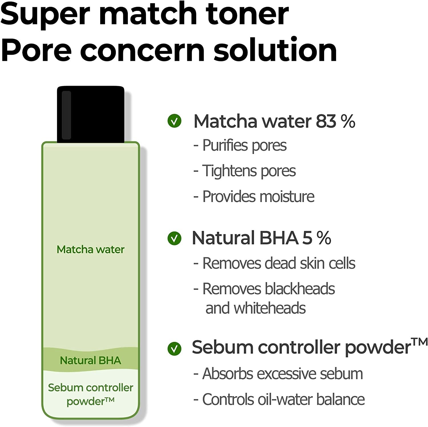SOME BY MI Super Matcha Toner is a refreshing, clarifying formula designed to balance and purify the skin. Infused with Matcha (Camellia Sinensis Leaf Extract), it helps control excess oil and tighten pores, while Willow Bark Extract gently exfoliates for a smoother texture. Niacinamide brightens the complexion, and Centella Asiatica with its active compounds (Madecassoside, Asiaticoside, Asiatic Acid, Madecassic Acid) soothes and strengthens the skin barrier. With added Tea Tree Water and Houttuynia Cordata Extract, this toner calms irritation and leaves the skin feeling refreshed, clear, and balanced.