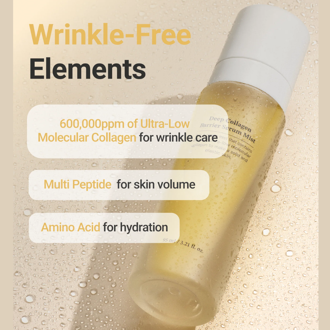 SUNGBOON EDITOR Deep Collagen Barrier Serum Mist is a hydrating facial mist that strengthens the skin barrier and boosts moisture. Enriched with Collagen Extract, Peptides, and Hyaluronic Acid, it helps firm, smooth, and revitalize dull or dry skin. Ideal for all skin types needing a refreshing, nourishing glow.