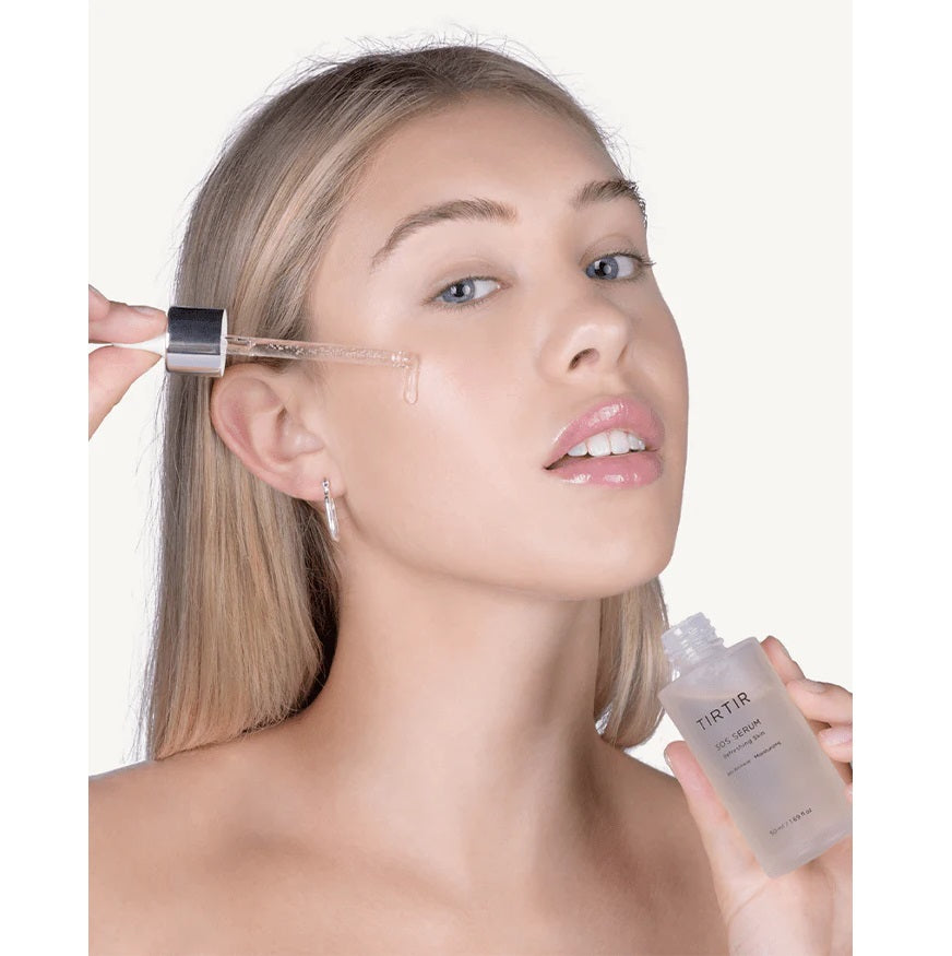 TIRTIR SOS Serum is a calming and hydrating serum designed to soothe sensitive and irritated skin. Infused with Witch Hazel Extract, Centella Asiatica Extract, and Licorice Root Extract, it reduces redness and promotes a more even complexion. Enhanced with Sodium Hyaluronate, Polyglutamic Acid, and Copper Tripeptide-1, this serum delivers deep hydration while supporting the skin's natural barrier. Its lightweight texture absorbs quickly, leaving skin feeling refreshed, balanced, and nourished. Perfect for daily use to restore and maintain healthy-looking skin.