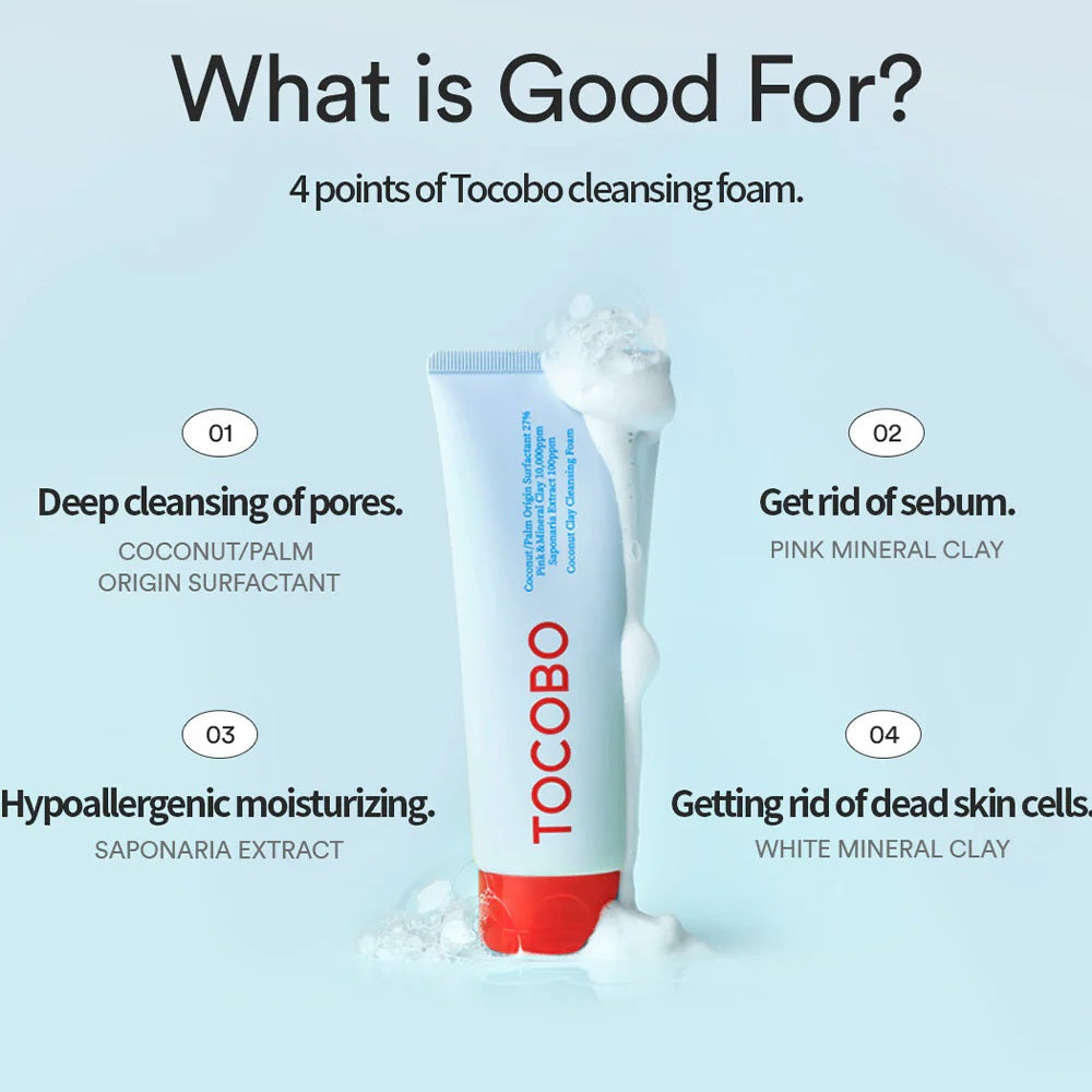 TOCOBO Coconut Clay Cleansing Foam is a rich, purifying cleanser that deeply cleanses the skin by removing impurities and excess oil. Formulated with Coconut and Bentonite Clay, it helps to absorb oil and detoxify pores without stripping moisture. Calamine soothes and calms the skin, making this foam ideal for balancing oil production while keeping skin soft and refreshed. Suitable for oily and combination skin types.