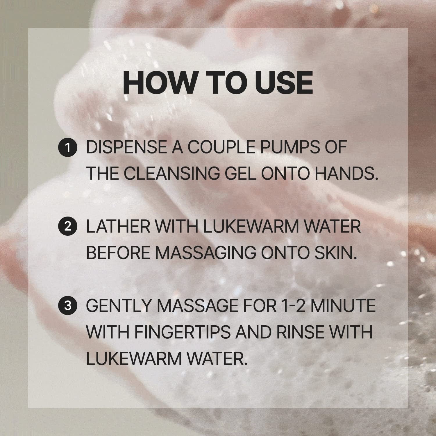 Apply a small amount of cleansing gel to slightly damp skin. Using circular motions, gently lather the gel onto the skin. Wash with lukewarm water.