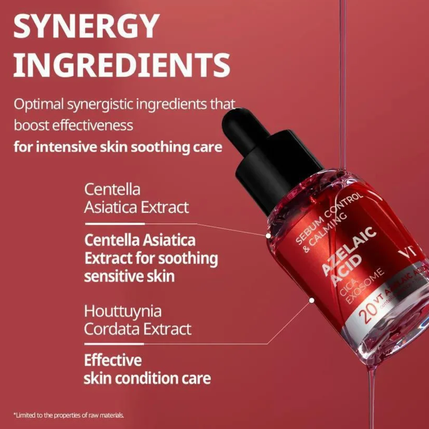 VT Azelaic A1 Calming Ampoule is a lightweight soothing ampoule designed to calm irritation, balance oil, and improve overall skin clarity. Formulated with Azelaic Acid, it helps reduce redness and support a more even-looking complexion. Panthenol and Madecassoside provide calming care, while Centella Asiatica Extract and Tea Tree Extract help comfort sensitive or blemish-prone skin. Multiple forms of Hyaluronic Acid deliver deep hydration, leaving skin feeling balanced, smooth, and refreshed without heaviness. Ideal for daily use when skin needs calming and oil control support.