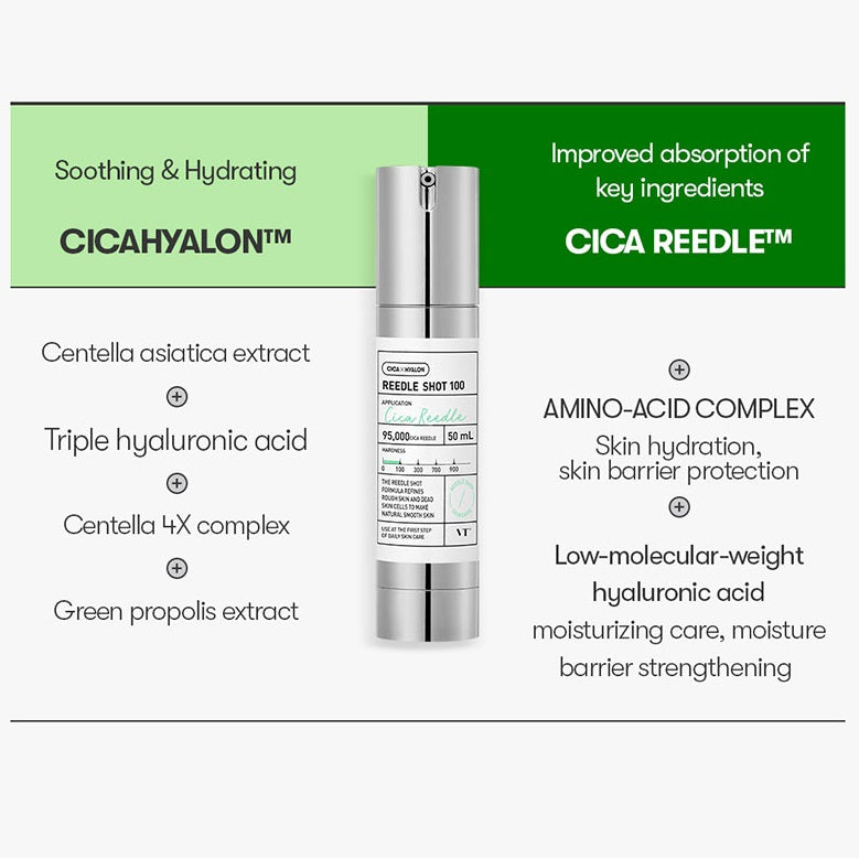 VT Reedle Shot 100 is an innovative, skin-soothing essence featuring micro-sized Reedles infused with active ingredients to deeply penetrate and revitalize your skin. Enriched with Niacinamide for brightening, Centella Asiatica Extract for calming, and Sodium Hyaluronate for hydration, it targets dryness, irritation, and dullness. The essence also contains amino acids, Propolis Extract, and Macadamia Seed Oil to strengthen the skin barrier and enhance overall texture. Experience smoother, healthier-looking skin with this advanced formula designed for maximum efficacy.